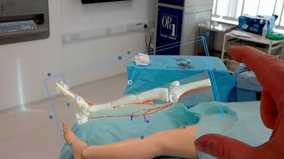 通過HoloLens眼鏡,將腿部CT掃描圖像中的骨骼和關鍵血管的位置準確地覆蓋在病人的腿上,可以讓外科醫生在手術中能夠“透視”手術部位。