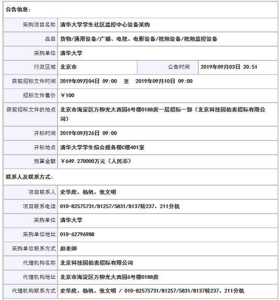> 清華大學(xué)學(xué)生社區(qū)監(jiān)控中心設(shè)備采購公開招標公告