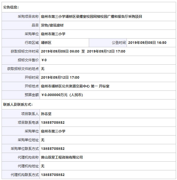 > 宿州市第三小學埇橋區錄播室校園網絡校園廣播和報告廳采購項目