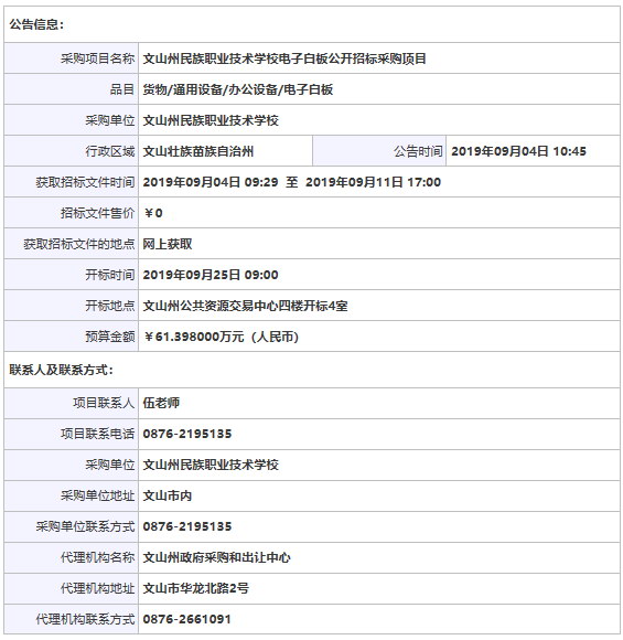 > 文山州民族職業技術學校電子白板公開招標采購項目