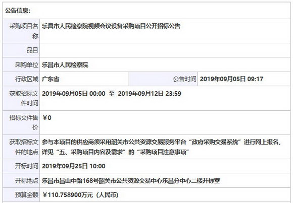 > 樂昌市人民檢察院視頻會(huì)議設(shè)備采購(gòu)項(xiàng)目公開招標(biāo)公告