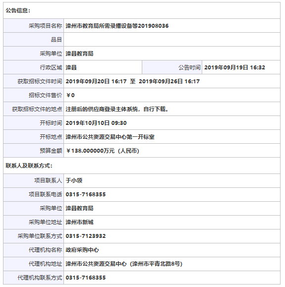 灤州市教育局所需錄播設(shè)備等201908036招標(biāo)公告