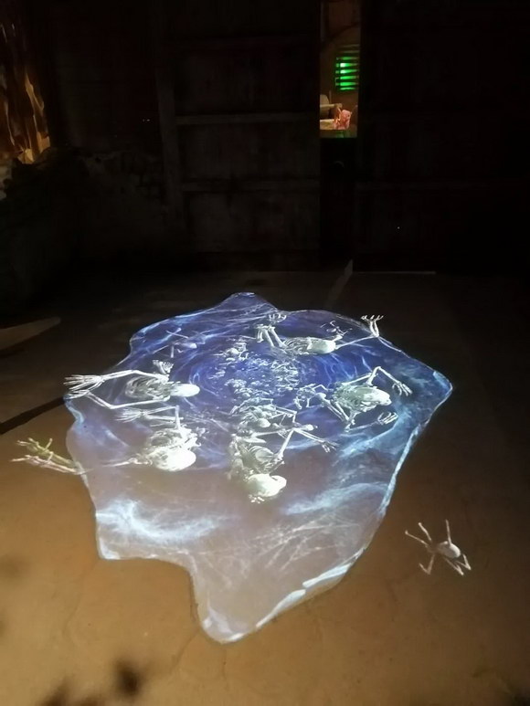 構思巧妙的地面互動投影,當你上一秒還沉浸在大話世界的情懷中時,下一秒地面就有骷髏突然冒出,化身一個大話西游主題的“鬼屋”。在不斷遞進的情緒感受中,把對電影經典IP的浸入式體驗推至最高潮。