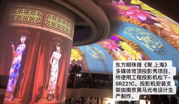 本次以東方明珠塔零米大廳穹頂為載體的IP元年首秀——《聚·上海》多媒體穹頂投影秀,其自主研發的5款可愛的IP形象:東東、方方、明明、珠珠、塔塔,出現在投影秀上,上演了一場穿越時空、城市歷險等驚險刺激的視覺之旅。零米大廳巨大的環形穹頂內壁上含有棱紋,整個投影空間為雙層結構。為打造這場極具創造性與臨場感的穹頂投影秀,制作團隊通過30臺超高清大流明投影機和定制化集成的多媒體服務器系統,呈現這場總投射面積達2200㎡的高科技華麗秀演。此次2019年上海東方明珠塔《聚.上海》多媒體穹頂投影秀項目,均使用松下工程投影機SRZ21C,而投影機安裝支架均由南京黑馬光電設計生產制作。