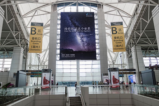 歷時4個月,經(jīng)過屏幕安裝、屏幕調(diào)試等階段,廣州白云機(jī)場西區(qū)出發(fā)大廳廣告屏順利完成改造。這塊14*20米的全彩超薄三星LED屏幕,成為T1航站樓場內(nèi)最大媒體。
