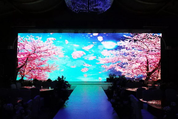舞臺對面是一個(gè)直徑3米的公主臺,該公主臺采用一臺NEC PA903X+(NP13ZL鏡頭)以垂直豎向投射方式打造。點(diǎn)亮投影機(jī),公主臺即刻變成一個(gè)多彩的大圓盤,當(dāng)新娘穿著潔白的婚紗置身公主臺,潔白的婚紗如施了魔法般即刻呈現(xiàn)出鮮花、火焰、星光等圖案,瞬間成為全場的焦點(diǎn)。