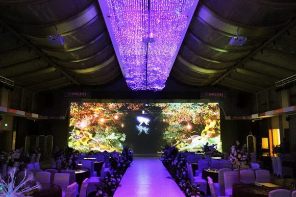宴會(huì)廳主舞臺是由3臺NEC PA903X+ (NP13ZL鏡頭)以吊頂正向融合投射方式打造的寬12米,高4米巨型全息紗幕投影。NEC PA903X+工程投影機(jī)以REC.2020廣色域、4K超高清圖像處理能力、豐富而準(zhǔn)確的色彩表現(xiàn)與紗幕既反光又透光的特性完美融合,為賓客打造了身臨其境的沉浸式體驗(yàn)。