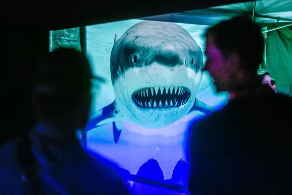 藝術(shù)家 Tamiko Thiel 和 /p 在小鎮(zhèn)的白色建筑上進(jìn)行投影,通過平板電腦捕捉來賓的影像疊加在魚的投影上。魚隨著平板的移動而游動,來賓不斷“侵?jǐn)_”它們的棲息地,這些魚最終將變成塑料垃圾。