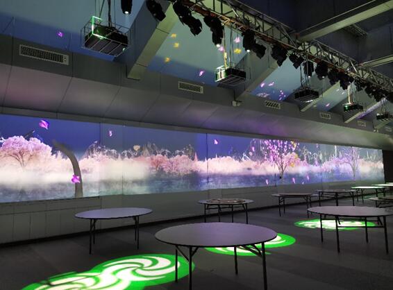 首先,本次項目的每個升降投影幕之間存在一根白色柱子,因此這長約30米的投影幕既非平面,也非弧面。但擁有豐富的融合處理能力的大視電子MPG30X支持融合帶寬度從0-2048像素連續可調和邊緣羽化技術,并配備了大視電子第三代數字光學校正純硬件幾何校正技術和全新一代色差調整,所以保證投影畫面無瑕疵的融合效果。