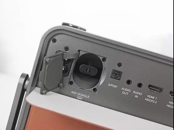 投影儀所有的接口都位置磁吸皮革防塵后蓋之下,從左往右依次是:電源插孔、WIFI加密狗插口、S/PDIF信號插口、兩個3.5mm音頻插口、兩個HDMI信號插口、Type-C插口、Micro SD卡槽、網線插口、USB 2.0 插口、USB 3.0插口。