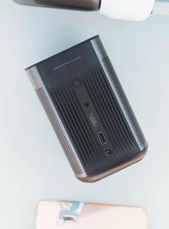 這次給大家的第一個小小驚喜,是藏在機身底部的一體支架。從底部摳開,可以實現0-10°的仰角調整。“一體支架的靈感來源于研發同事的出差途中,平時使用時我們常會在投影下方墊一本書或者遙控,有了一體支架,機器稍微帶起仰角后,人的觀感也變得更好了。”
