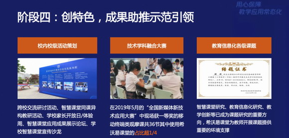 “在第四個階段,我們希望幫助區域學校打造標桿示范效應,通過舉辦智慧課堂活動或學科融合賽事、教育信息化各級課題活動等,協助學校產出系列教育成果,打造學校的多元品牌特色。例如跨校交流研討活動、學校家長開發日、智慧課堂應用成果展示論壇、技術學科融合大賽等。”希沃教研顧問一邊說,一邊在大屏上展示過往的活動案例,引發在場觀眾紛紛點贊。