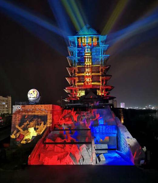 此外,整體塔樓安裝了250多臺明道新型戶外防水電腦燈和10臺激光燈,立體多緯度地將黃河樓點亮,通過創意光影秀為黃河樓增添活力。該光影秀的高質量投影為中國西北地區的文化夜游樹立了新的標桿,客戶對效果非常滿意,也為增加蘭州及其周邊地區的吸引力和活力,政府傾力打造黃河文化旅游帶做出貢獻。該項目在今年國慶期間更吸引了中央電視臺的采訪和報道。