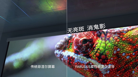 經過多年的潛心鉆研,光峰科技突破了傳統屏幕增益、色彩等關鍵技術特點,且運用獨創的ALFA技術,帶來了全新的柔性菲涅爾屏幕。本次發布會上,光峰科技共發布了2款FABULUS系列屏幕新品,分別是FABULUS百吋柔性菲涅爾波導屏、FABULUS 臻彩電動抗光屏。