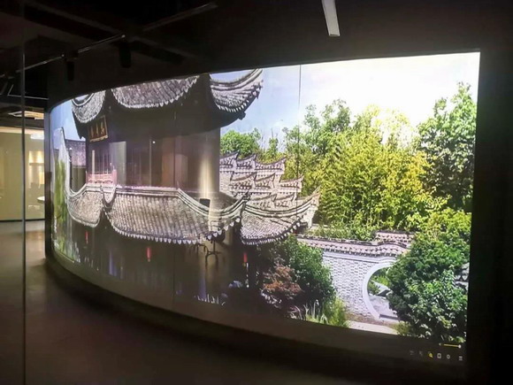 調光玻璃借助非線性光學原理,實現了不同角度同樣均衡的亮度顯示,由其他方向投射來的外環境光線不會對成像產生干擾,即便是在光亮展廳內也能大放異彩。超大尺寸的弧形顯示方案,更有利于沉浸式內容的展示,給觀眾以包圍的代入感,讓畫面的展現富有張力。