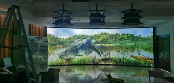 公司在進行實地考察之后,決定采用六臺激光投影機,并搭配上三臺純硬件融合器,投射在7*3㎡的金屬弧形硬幕上,通過硬件融合器實現被動3D效果,可以讓前來參觀的客戶更好地體驗井上煤炭作業。