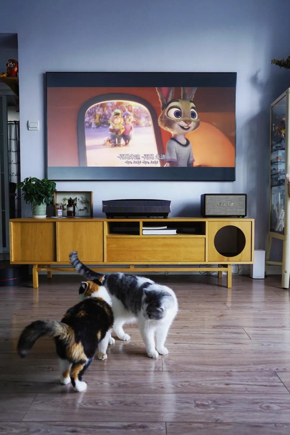 由于它屏幕是沒有電路的,所以非常薄,比我想象當中存在感弱很多。原本以為有一塊屏幕,在視覺上會擠壓空間,但實際上并沒有!屏幕比電視柜靠墻的距離還要薄~屏幕的作用是抗光,可以增強在強光環境下的投影效果。