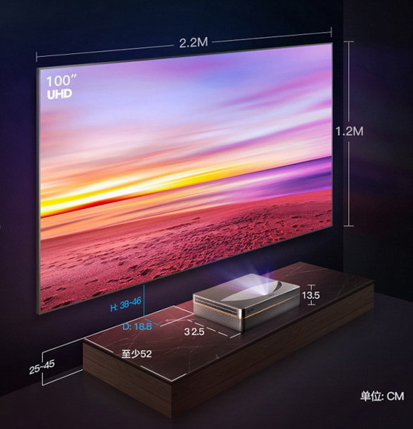 越小的投射比,可以讓激光電視的激光鏡頭離投影屏幕越近,越能節省空間,融入客廳家居。長虹4K激光電視D5UR采用超短焦技術,投射比達0.21:1,即投影100英寸的巨幅畫面僅需離屏幕18.8cm。