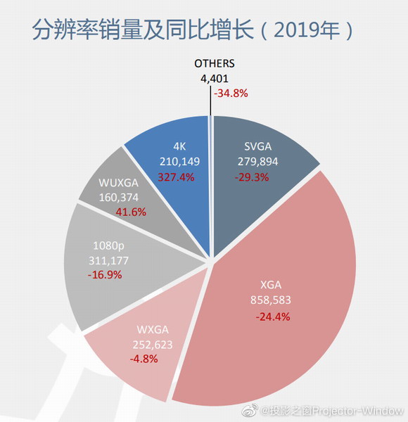 2019年除WUXGA(寬屏超級擴展圖形陣列)以及4K外,各階分辨率產(chǎn)品銷量均有所下降,市場對于產(chǎn)品的分辨率需求提升較大。就目前而言,家用投影市場的新品基本都配置有1080P、4K的分辨率,更多的用戶希望得到更加高清的視覺體驗并很樂意為此買單。