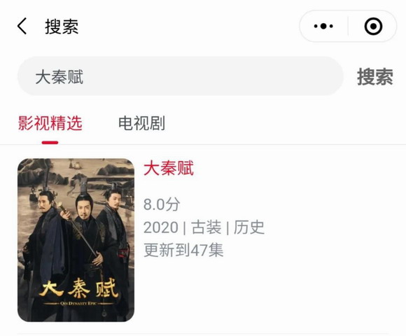 第二步:在小程序輸入想要看的影視資源名字,比如“大秦賦”,再按搜索。