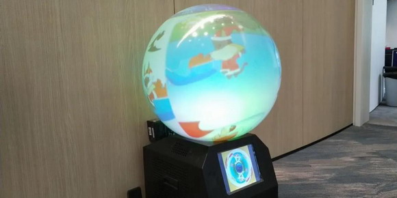 互動球幕系統是一款新型的球形屏幕投影演示設備,它打破了以往投影圖像只能是 平面規則圖形的局限。憑借其無縫光學樹脂球幕和高流明投影儀的配用,在球幕上顯示出 超震撼的動態視覺效果。其原理是將投影儀置于球幕底部,信號經過反射投射到球面屏幕 顯像。使整個球體看起來就像一個科幻的水晶球,可以很好的吸引參觀者的眼球。球幕可 顯示文檔、圖片、視頻等,并且可以在球幕上進行互動觸摸控制。對圖片、視頻等進行開關、縮放、移動.