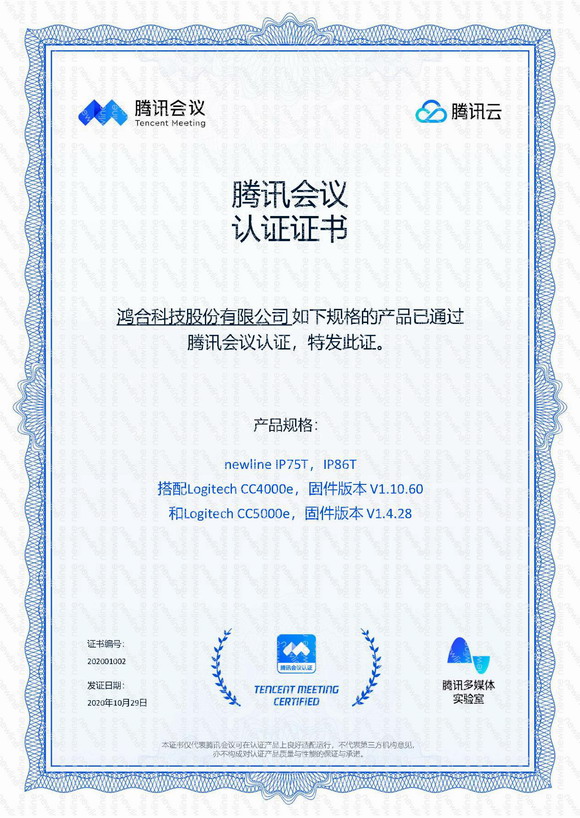 除了newline TC65之外,newline IP75T、IP86T兩款產品也順利通過騰訊會議認證,并獲得認證證書,這充分展現了newline在核心技術、產品研發方面的深厚積累與強大實力。75英寸和86英寸兩種尺寸可以匹配更豐富會議空間,為企業用戶提供更多高穩定性、高可靠性、高安全性的多元化視頻會議解決方案。