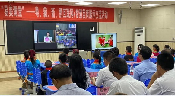 易美課堂“互聯網+教育幫扶”活動,通過錄播終端、互動大屏,將天南海北、城鄉內陸連接起來,讓相隔數千里的廣州、西藏林芝、新疆疏附、貴州黔南的學生們“同上一堂課”,共同開啟“發現美、欣賞美、創造美”的旅程。