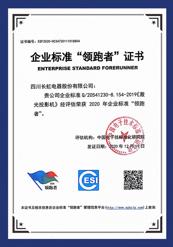 長虹激光榮獲激光投影機行業【2020年企業標準“領跑者”證書】