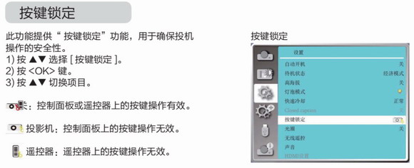 (3) 在方便進(jìn)行投影機(jī)面板操作的情況下,比如調(diào)試人員可以方便夠到面板,或者按鍵面板沒有被遮擋,可直接用投影機(jī)面板按鍵操作。為了避免投影機(jī)的誤操作,部分投影機(jī)提供了遙控器或面板的鎖定功能。