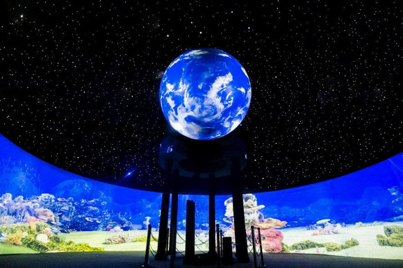 穹頂下,還能見到游客利用手中的光束,經光敏識別技術的指引,一起尋找藏在地上的海洋生物。每找到一只,都會觸發一段動畫,最后,當所有的生物都被找到時,整個廳中會跳出一段展現海洋奇跡的視頻,樂趣感和成就感翻倍!