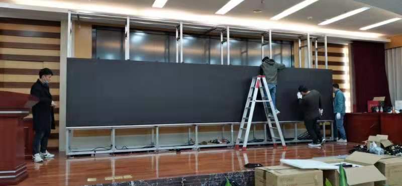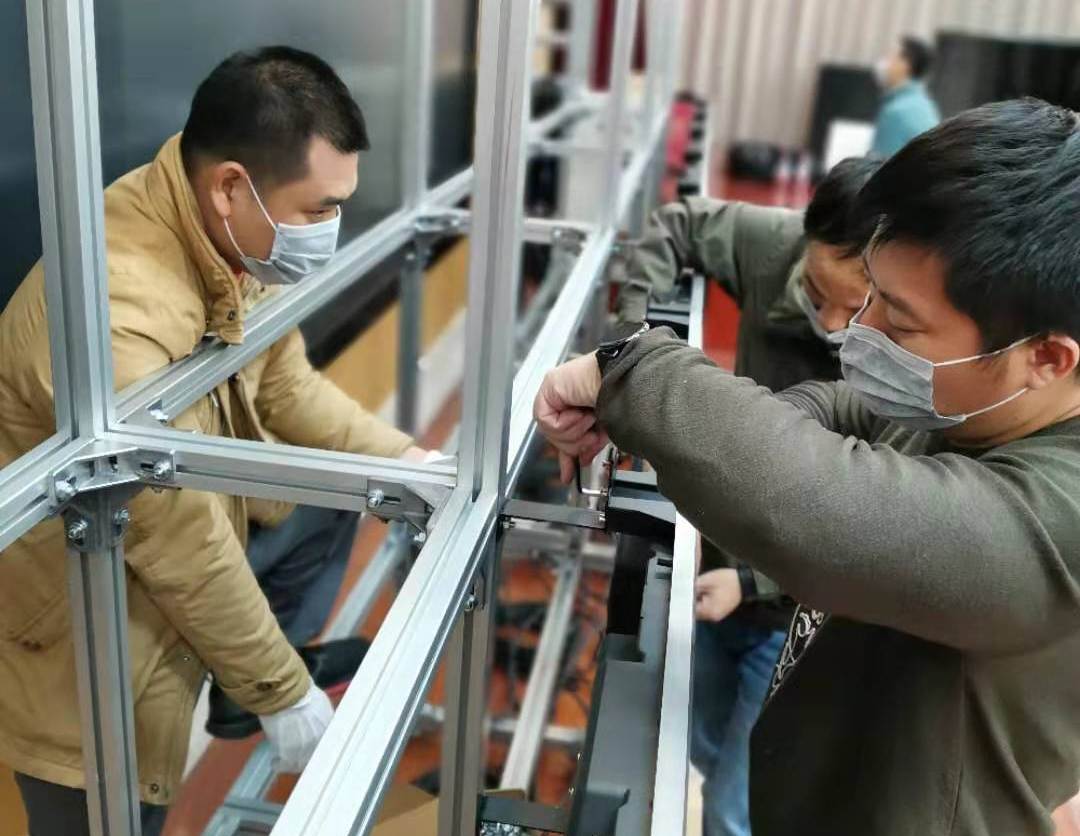正值新春佳節,全體員工休假,但各部門同事深知疫情不等人,迅速整裝集結,了解庫存狀態、組織工程安裝、設備運輸等,各項工作緊鑼密鼓地展開。針對現場安裝高度不足的問題,工程師們在公司總部對現有的支架進行切割改造,運抵現場后再與先期抵達的顯示單元、處理器等設備進行搭建、調試,突擊隊員們通宵加班,爭分奪秒搶時間。到大年初三上午8 時,通常需要一周才能完成的系統,從設計、備貨、運輸,到安裝、調試,僅36小時就順利建成,比要求完成的時間整整提前了12個小時!
