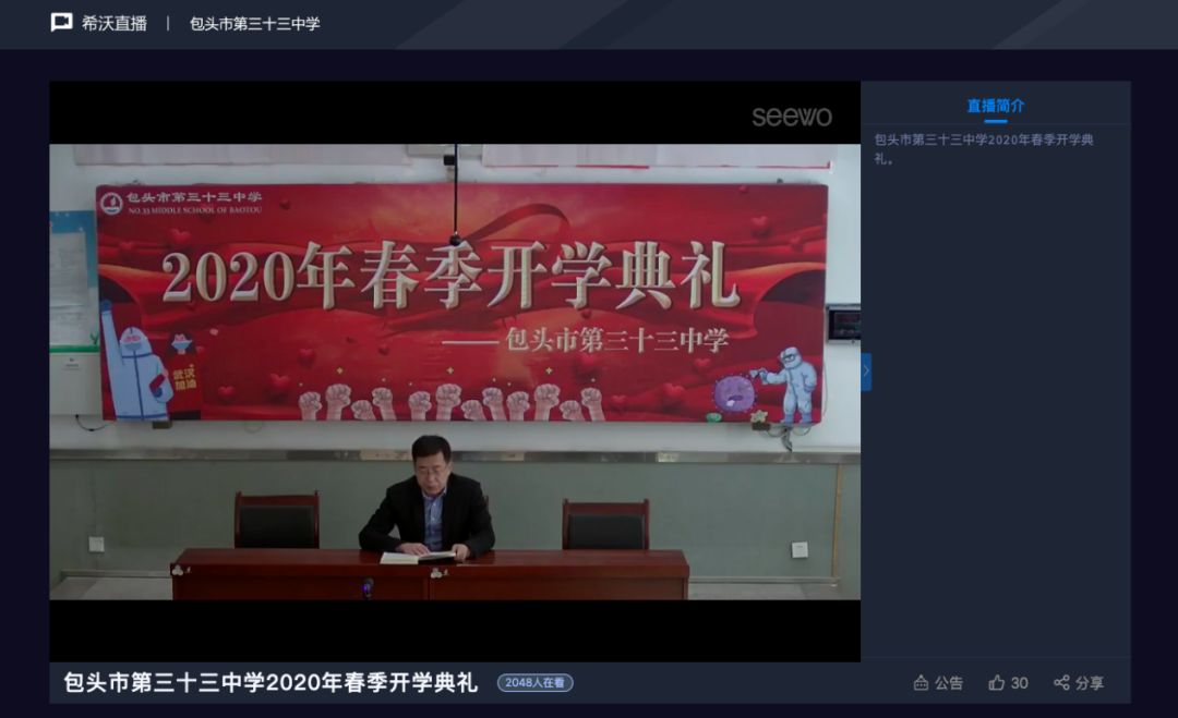 本次開學(xué)典禮是通過希沃的常態(tài)化錄播平臺(tái)同步線上直播,三十三中的2千多名師生們參加,開學(xué)典禮上肖作民校長講話,陶慶豐校長主持。