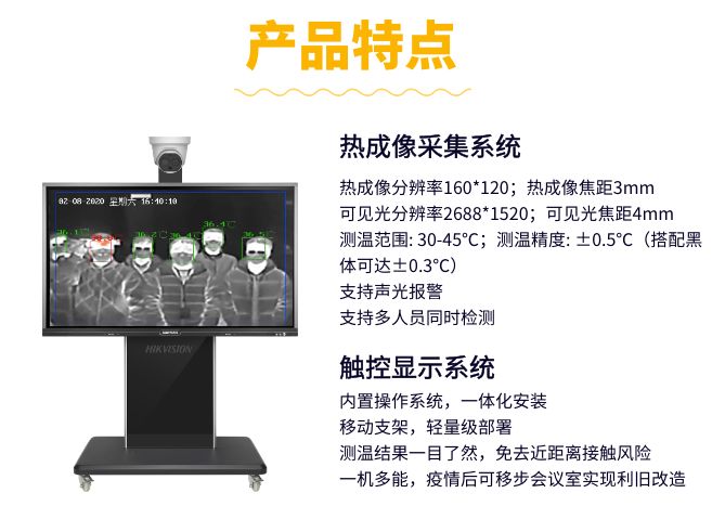海康威視測溫一體機解決方案主要應用于人員密度較大處的體溫快速篩查,采用一體化設計,便于快速部署測溫通道。