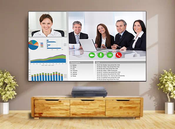 華錄激光電視支持手機、ipad無線投屏,可以清晰顯示手機、ipad辦公軟件、視頻軟件信息內容(例如:釘釘、WPS),將移動終端中的會議討論資料(PPT、Word、Excel)、視頻內容投屏顯示,傳輸信號穩定,方便公司主管、員工、客戶在視頻會議中的溝通交流、及時反饋工作信息,保證工作進度。