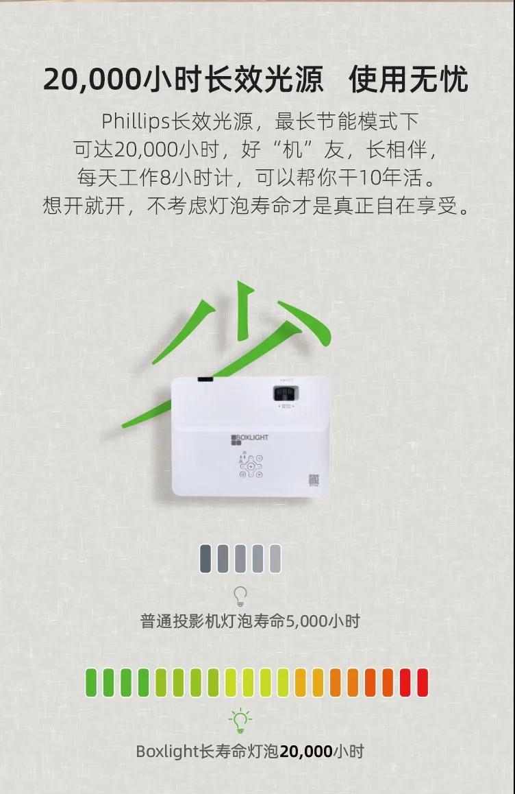 金屬鹵素燈泡價格便宜,一般使用2000小時左右亮度會降低一半。UHE燈泡價格適中且發熱低,在使用2000小時后亮度幾乎不衰減,是目前廣泛采用的理想光源。UHP高能燈發熱較少且使用壽命長,一般可以正常使用4000小時以上,并且亮度衰減很小,但價格昂貴。Boxlight智能A3是長壽命的UHP燈泡,是高性價比的優選產品。