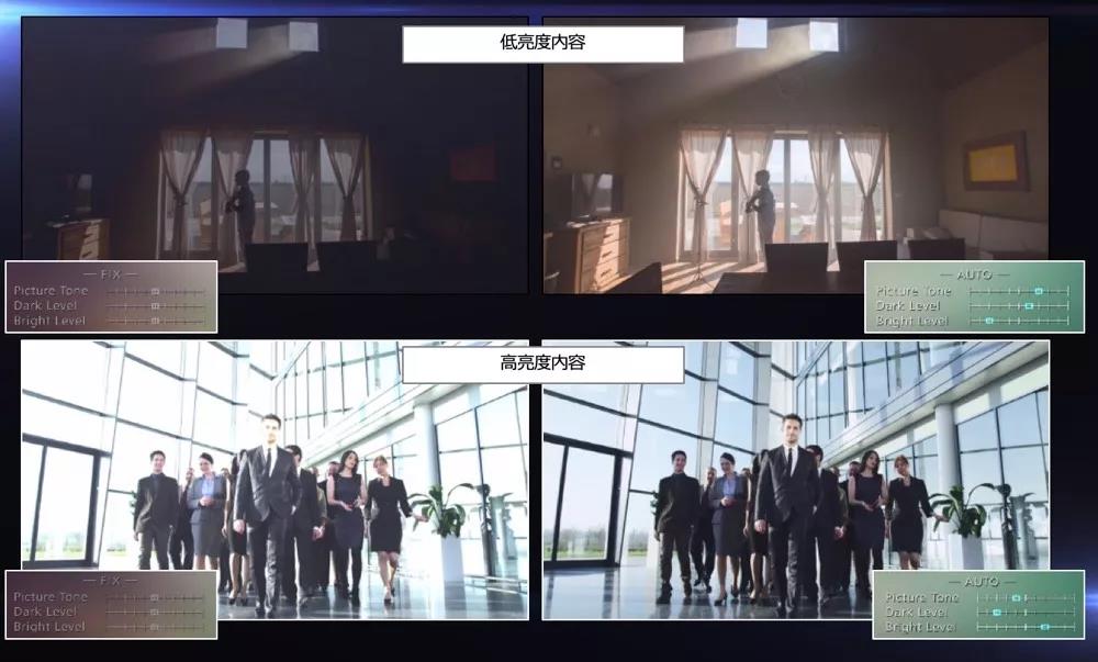 也就是說,不管電影制作的亮度高低、甚至沒有亮度信息,也不管電影場景是明亮場景、暗場景、或是明暗反差巨大的大動態場景,JVC逐幀適應HDR都能逐幀實時分析,自動匹配參數,自動實現每幀HDR畫面的最佳畫質。