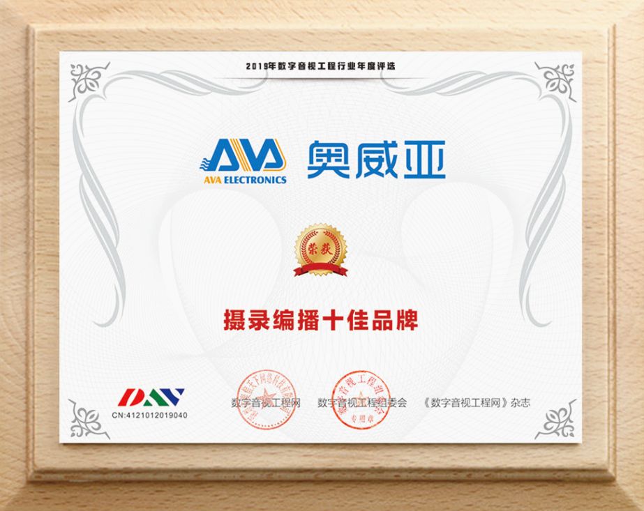 2019年9月23日,數字音視工程網、《數字音視工程》雜志聯合主辦了“2019年音視工程十佳行業品牌評選活動”,該活動由廣大廠家、經銷商、工程商、終端客戶、媒介的從業人員網絡無記名投票。奧威亞通過前期經銷商、工程商、終端客戶等行業相關人士的線上線下投票初選,以及后期行業評審專家根據入選企業在產品研發、產品市場情況、客戶滿意度、產品后期服務等多個維度的表現進行綜合測評后,最終榮獲“攝錄編播十佳品牌”。