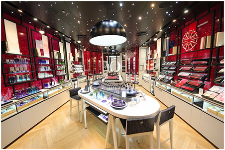 不止產品色彩設計,門店色彩對顧客的消費行為也有著至關重要的影響。當我們去商場購物,商品都置于陳列的環境氛圍中,環境色與商品色相互作用,如果配色恰到好處,所帶來的視覺沖擊感遠勝單個商品。例如走進珠寶店、美妝店或者服裝店這種本身商品時尚感強烈、介入度(一個人基于內在需要,價值觀和興趣而感知到的與客體的關聯性程度)較低的品牌門店中,外在顏色的刺激更加能夠影響購買決策。陳列柜里明亮的色度、高雅的色調無時無刻不刺激著人們的視覺,喚起注意,激發聯想,誘發購買欲。