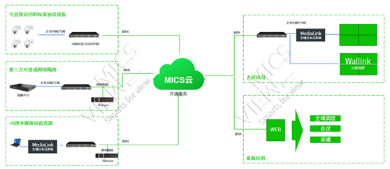 MICS云既輸出完備的可視化服務,又提供基礎可視化云信息的調度能力。MICS云現已提供包括全域視頻聯動調度、視頻錄播、云視頻會議等多種可視化應用服務,并將不斷擴充完善。同時MICS云擁有開放平臺服務能力,現已有WEB服務、流控制服務、開放接口等多種平臺,可結合場景快速便捷地調用可視化信息,開發符合不同場景的業務應用,或與其它云或系統集成整合。