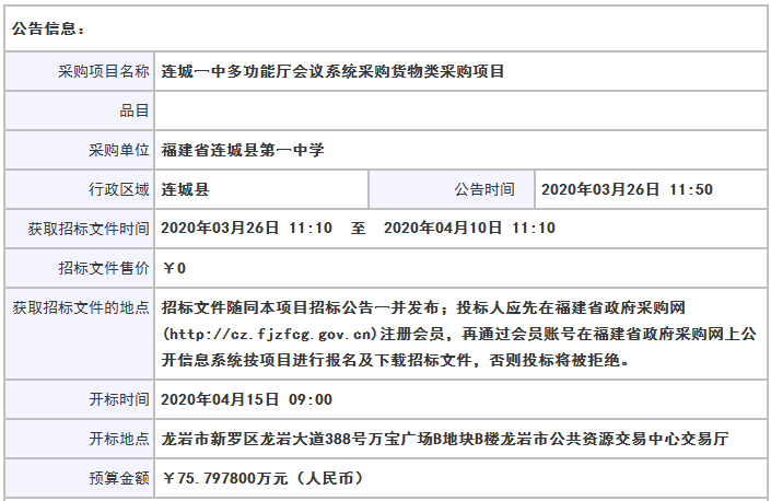 連城一中多功能廳會議系統采購貨物類采購項目招標公告
