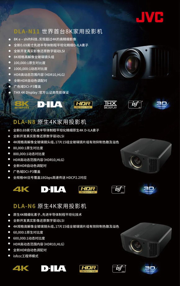 JVC 獅子座(LEO系列,N11、N8、N6)擁有8K/4K分辨率、優(yōu)異的亮度、業(yè)界最高的原生對比度、超廣的色域和精準(zhǔn)的色彩,完美匹配4K藍(lán)光技術(shù)的核心優(yōu)勢(4K分辨率、HDR、超廣色域)。
