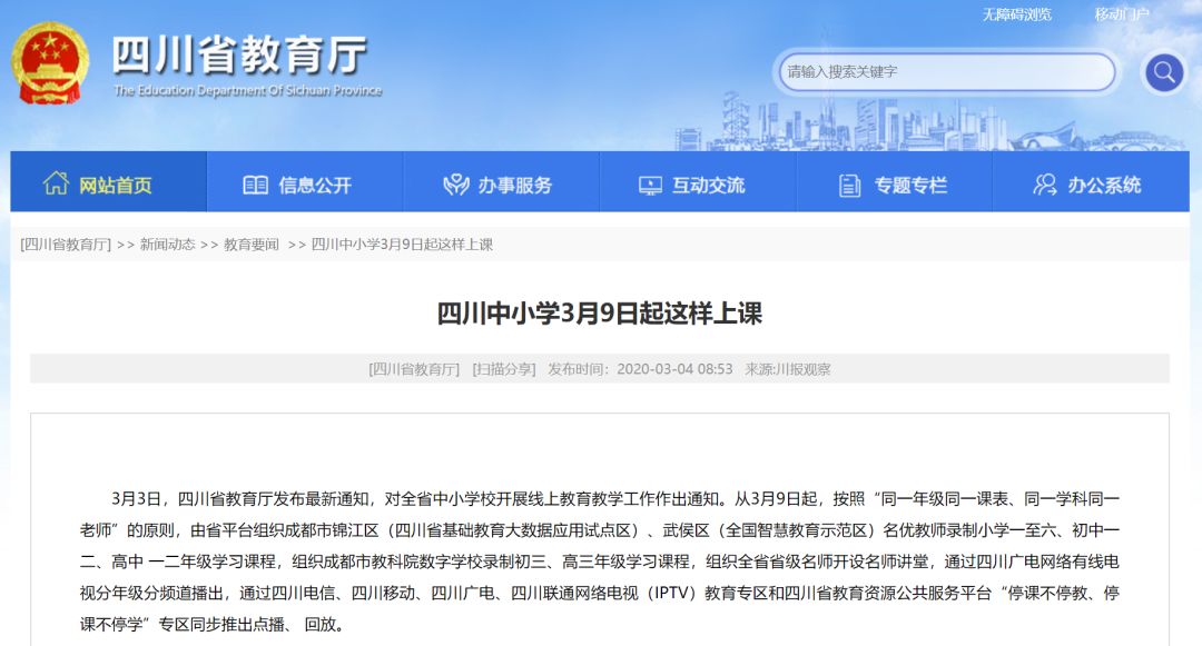 3月9日起四川中小學線上“開學”