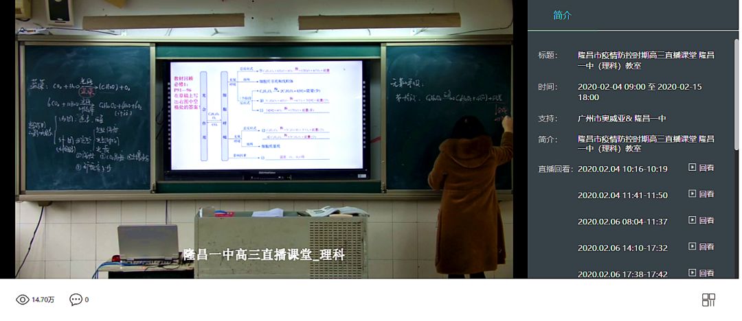 2月1日開始,隆昌市教體局在奧威亞錄播教室支撐下,開展全市高三文理科和初三在線課程教學,目前已覆蓋全市多所學校,受益學生超8000多人,開通在線課程800多節,截至3月1日,直播點擊量超3000多萬人次,最高觀看人數達到1萬多人。
