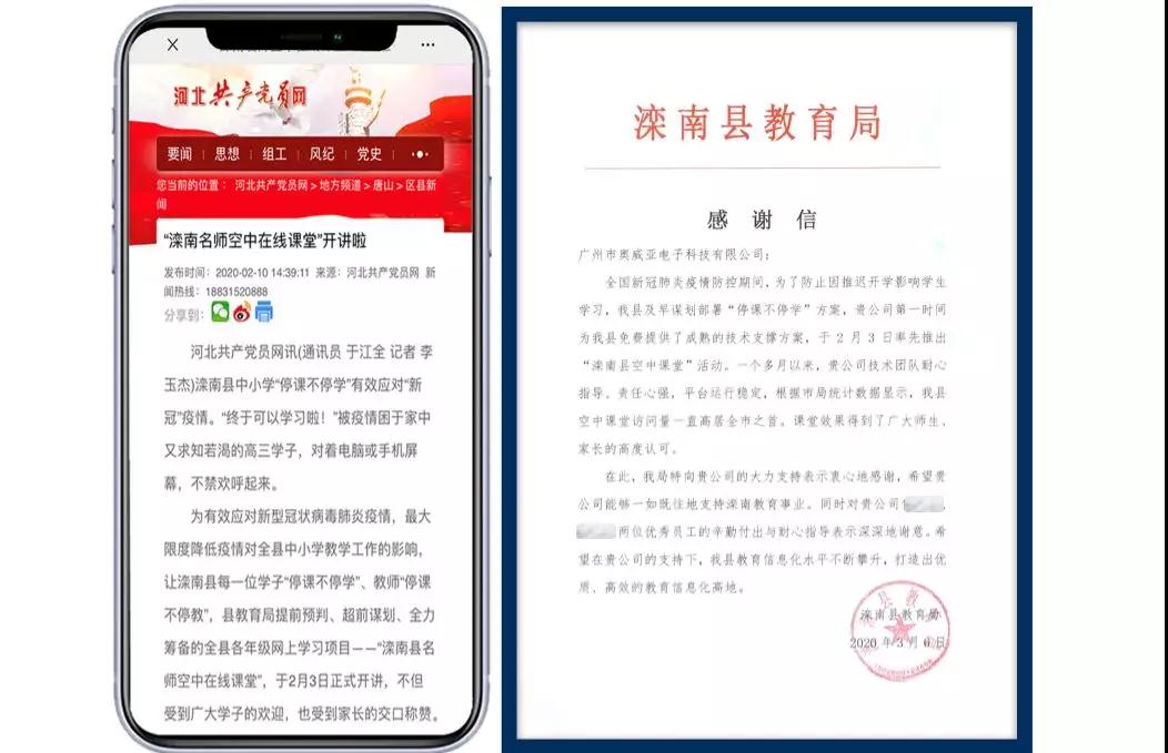 疫情以來,奧威亞憑借“云+端”技術優勢,已成功助力31個省份(含香港特區)301個區縣教育系統,形成高效、高質、有序的“停課不停學”好做法。其中,河北多地教育局和學校通過奧威亞服務支持,充分調動了本地名師資源,實現全覆蓋、多層次的線上教育模式,贏得廣大師生和家長的交口稱贊。
