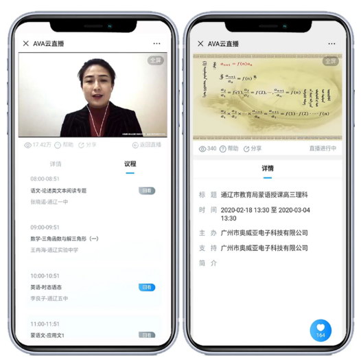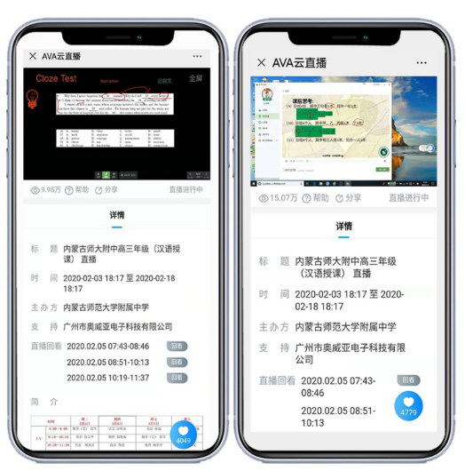 2月6日,阿拉善盟第一中學在奧威亞錄播教室和移動錄播設備支撐下,順利組織高三學子開展“空中課堂”,這也是內蒙古自治區第一個實施疫情期間“停課不停教、不停學”的學校。通過奧威亞云直播技術,學生只需在家通過手機、平板、電腦等便攜方式即可進行聽課,真正實現在“師生不聚集”前提下,開展教學活動。