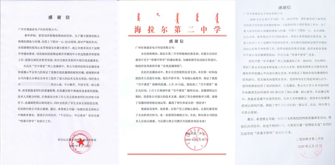 奧威亞“云+端”技術憑借高并發高穩定技術,以及符合教師教學習慣的優勢,還成功助力內蒙古烏蘭浩特市、呼和浩特市、內蒙古錫林郭勒盟、內蒙古呼倫貝爾等多地教育系統高效、高質、有序開展工作。此外,奧威亞還為客戶提供高效率、高質量、以客戶至上的貼心服務,在接收需求后的第一時間,選派專業技術人員到當地對接,對老師和電教人員進行悉心指導,保障直播順利穩定進行。為此,奧威亞贏得了廣大師生、家長及教育局的一致好評。