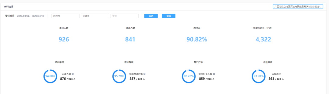 報名開始后,全縣教師積極響應,踴躍參與,截止3月5日,共926名教師成功報名參與首期7天初級階段培訓。在隨后的正式培訓中,老師們興趣盎然,時常在學習群里互相交流分享學習心得,分享軟件操作技術。首期初級階段培訓結束,全縣教師累計學習時長4322小時,人均學習時長4.7小時,首期共841名教師結業(yè),培訓結業(yè)率90.82%,實現(xiàn)大部分教師掌握交互式課件制作方法的預定目標。