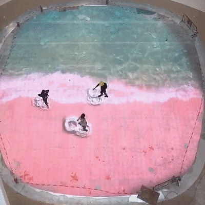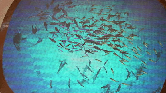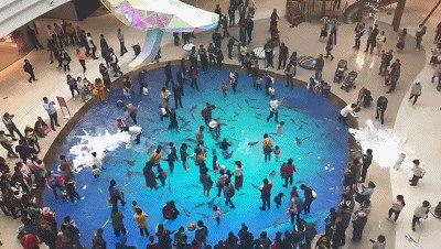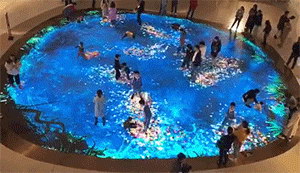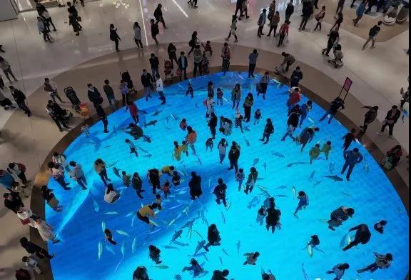 當人們走過時,地上的海洋精靈仿佛有所感應,四散游去。小孩子們則開始了一場追逐地上游動小魚的游戲,嬉戲打鬧中,享受著愉快的親子時光。