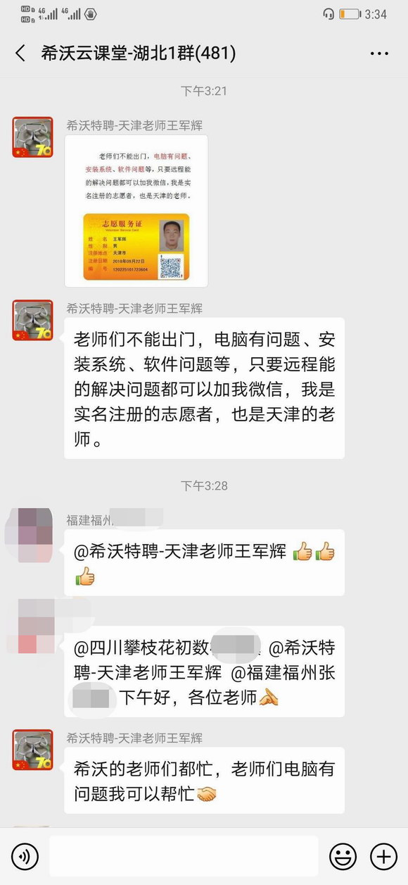 王軍輝老師不僅僅關心自身學校的答疑情況,還自愿加入湖北云課堂答疑微信群,幫助湖北老師熟練使用希沃白板云課堂功能,在這個特殊時期為湖北的老師們雪中送炭,成為教育戰線上的“最美逆行者”。