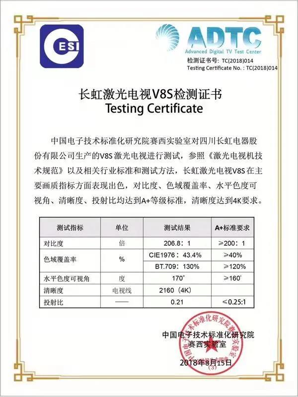 獲得中國電子技術標準化研究院賽西實驗室頒發的“A+級”4K激光電視檢測證書。